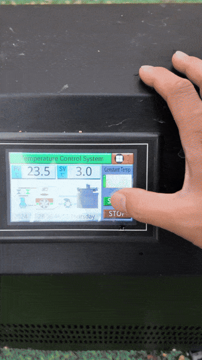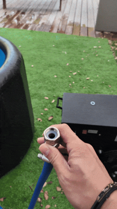 Inflate the tub, connect the bottom hose from the tub’s bottom outlet to the chiller’s bottom outlet, and the top hose from the tub’s top outlet to the chiller’s top outlet. Fill the tub until the water level reaches the top hole of the tub (ignore the printed fill line). Once filled, turn on the chiller to start cooling the water.